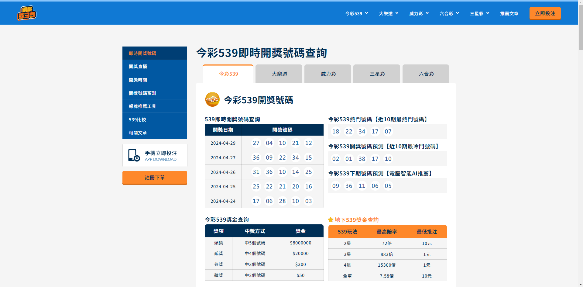 今彩539的即時開獎號碼查詢可以透過訪問台灣彩券官方網站或鋼鐵539。這兩個平台均能提供最新、最準確的今彩539開獎號碼和其他相關資訊,例如過往的開獎紀錄、遊戲規則、以及中獎注數等。